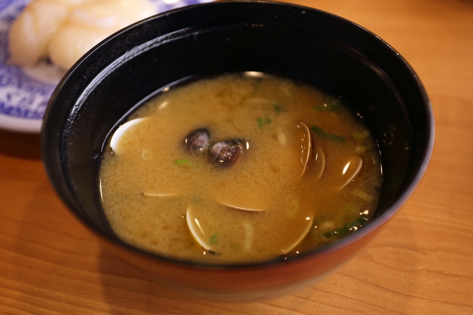 吃到一個段落,點碗味噌湯來喝,一樣是使用ipad點餐,我們正討論他們要怎麼把湯送來,突然聽到「咻」的一聲,味增湯一樣從高速的運輸帶送到我們面前。