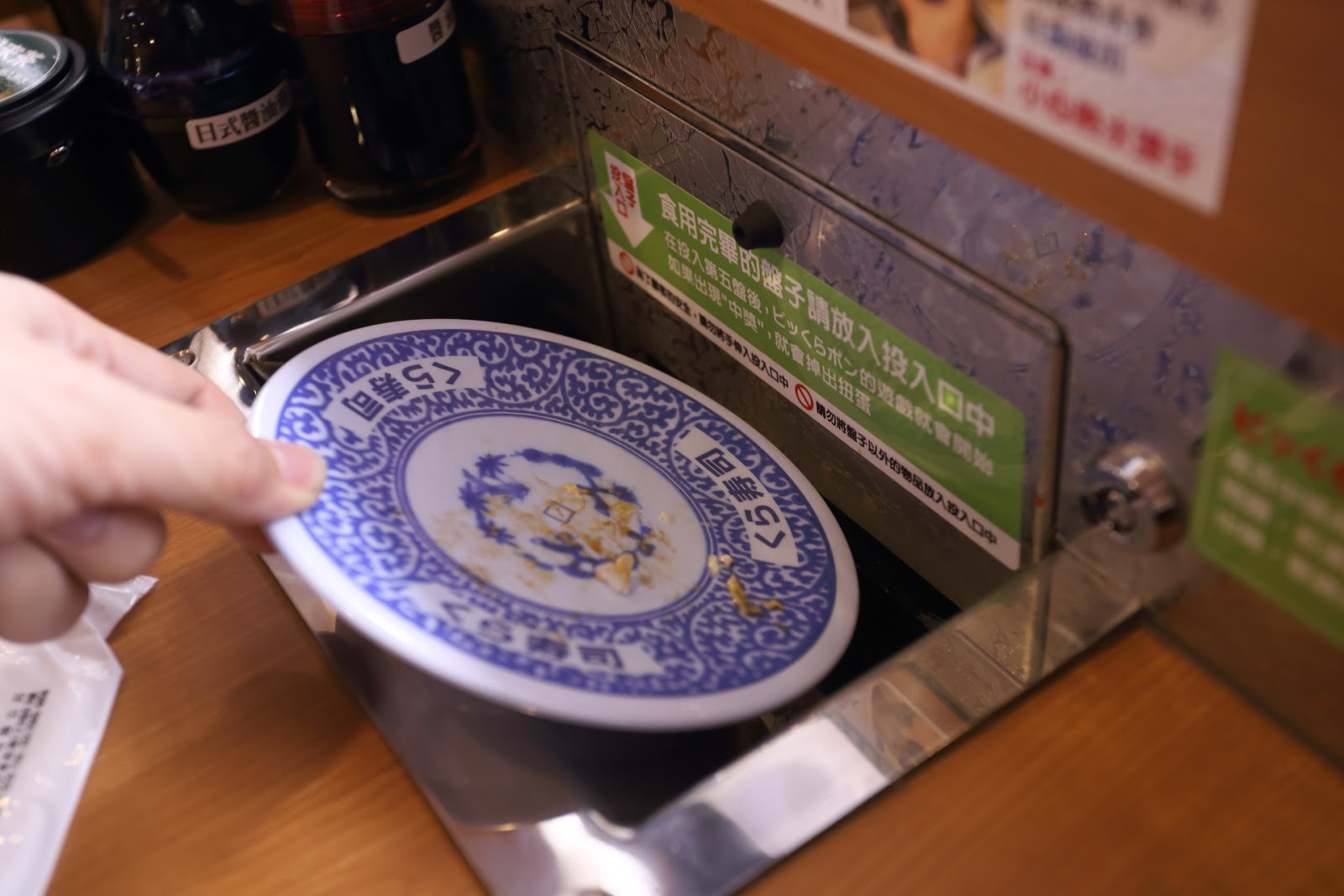 不知不覺就吃了超過五盤,盤子食用完之後要放入座位旁的回收洞口中,以方便計算總共食用的盤數。