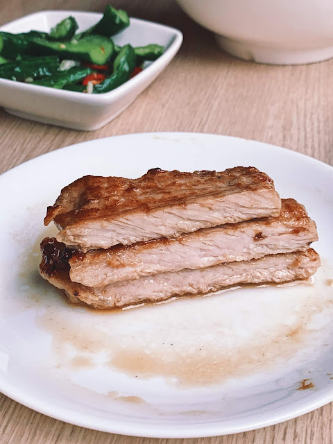 而且店家的豬排有著些許的厚度,咬起來更是帶勁十足,另外經過醃製過後的醬油鹹香,更添增了豬排的美味度。