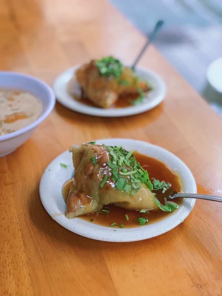 阿姨將餅皮煎至微微焦色,柔柔軟軟的趴在盤中,看起來很像法式可麗餅,吃起來是令人感到意外地稍稍黏牙口感。
