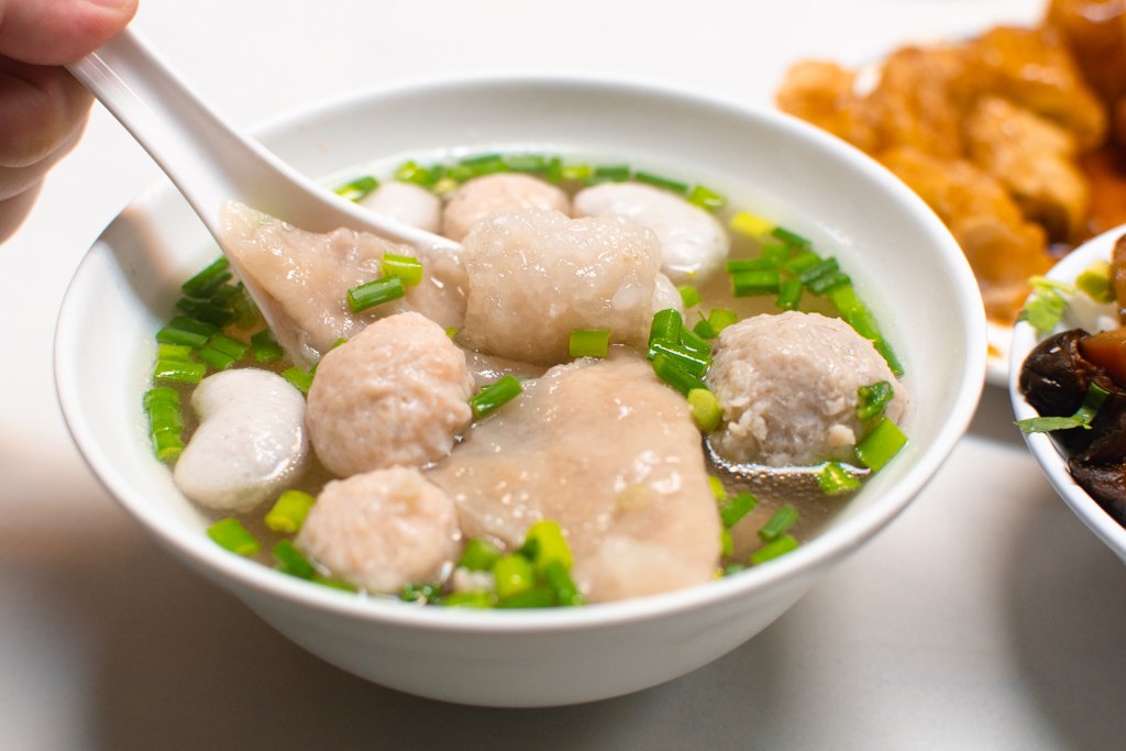 湯品裡的佐料豐盛,綜合湯可一次品嚐魚丸、魚肚、魚皮、粉蒸及肉餃。頭一次吃到粉蒸,以生腸裹粉,咬下去是脆口的奇妙口感。