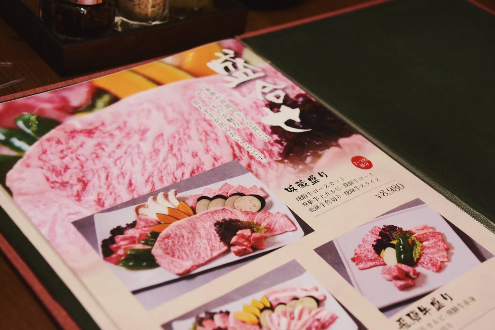 等待的大廳旁是一間很小的超市,販賣新鮮的飛驒牛以及當地的特產,瞧瞧那油花,讓我在外面苦等之時,得拼命把口水吞回去。 一到位置迅速點了餐,選定¥8,980的套餐,內容有飛騨牛ロースカット、飛騨牛上カルビ、飛騨牛ロース、飛騨牛角切り、飛騨牛スライス,適合2-3人食用。 這餐大概貴在那片超大的牛里脊肉,單點要價¥6,080,算了算還是選套餐比較划算。