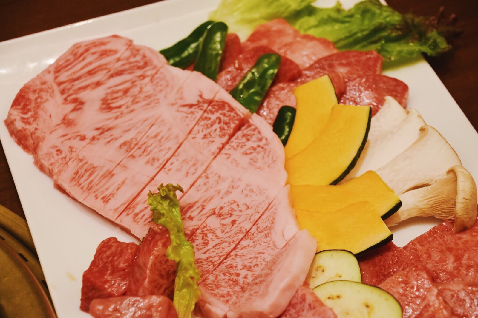 日本燒肉,配菜內容就死板些了,多半是些蔬菜啊…像是洋蔥、青椒什麼的,一般般,也許也是怕太多種類,影響食用飛驒牛的口感,但當下想著,要是最後能來個烤麻糬那該有多好。