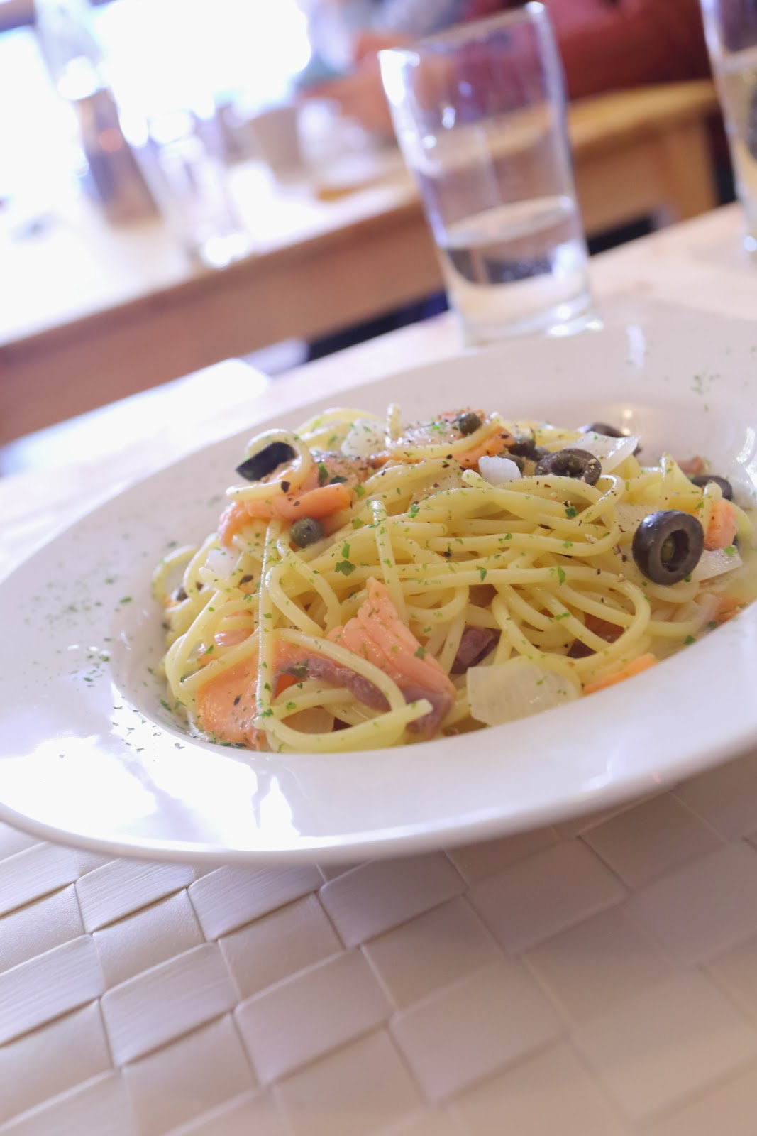 我們總共點了兩種義大利麵,還有另一個就是鮭魚酸豆義大利麵。 裡面的燻鮭魚的份量給得頗多,搭配酸豆,把燻鮭魚的腥味輕輕的抹掉了一些,讓整體味道平衡了些,使燻鮭魚的表現不會太過強眼,不過要是麵條再硬一點點會更好吃!
