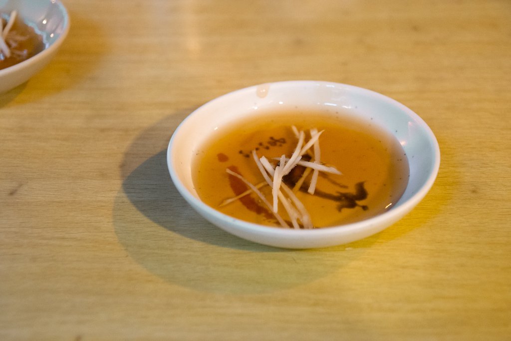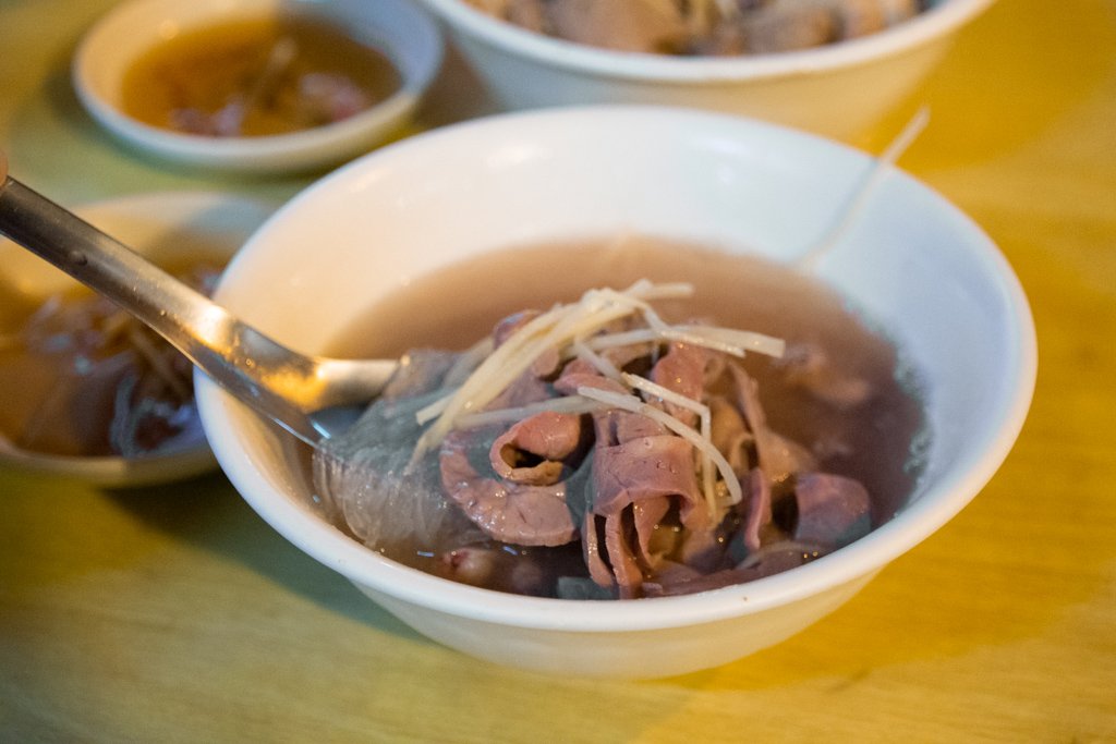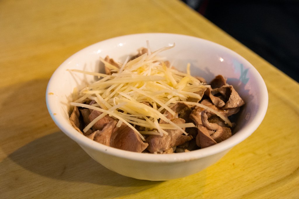 冬粉撈起的份量,大概夾進嘴裡兩口就沒了。豬心處理得乾淨得宜,毫無雜味,該有的彈軟盡在咀嚼之中。湯汁些許,舀起入口清甜,搭配些許薑絲,是很輕鬆的一道小食。