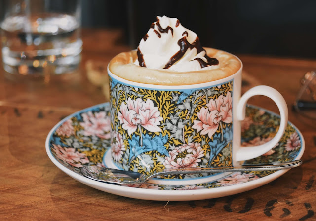 咖啡上頭是白色的鮮奶油,淋上了一點巧克力醬,這裡使用的咖啡杯美麗極了,杯紋印上的是花朵的圖騰,有粉有藍有黃,繽紛交錯,濃濃的異國情調展露無遺,咖啡裡頭掺入了卡哇魯咖啡酒及龍舌蘭,喝下時有咖啡酒的甜香,後勁是龍舌蘭微微的嗆辣感,。