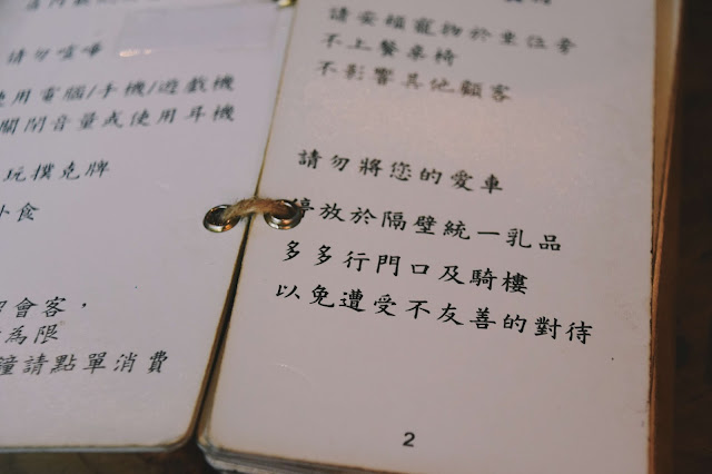 打開menu,看到一些關於小屋的用餐規則,有一行我不禁笑了:「請勿將您的愛車放到隔壁統一乳品多多行門口及騎樓,以免遭受不友善的對待」,這守則應該要貼在正門口才是(笑)