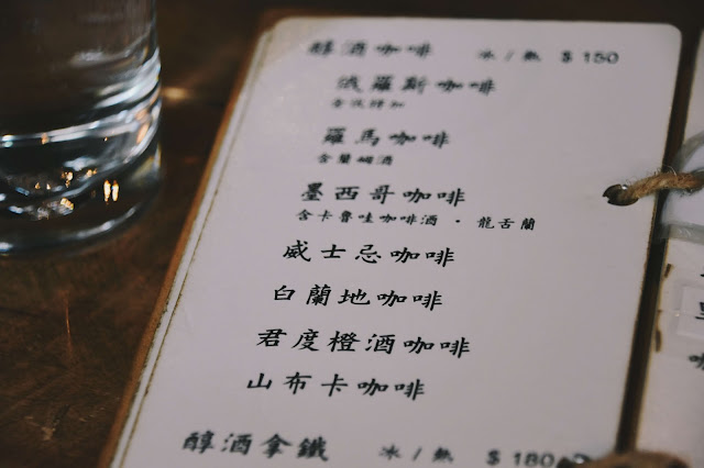小屋咖啡的飲品甚多,琳琅滿目,除了常見的幾種咖啡飲品,還有我最愛的含酒精類咖啡(去到哪兒都需要點酒),也有威士忌、紅白酒,讓人白天就能在這裡享有微醺感,若不喝咖啡的人,也有茶品可以選擇。