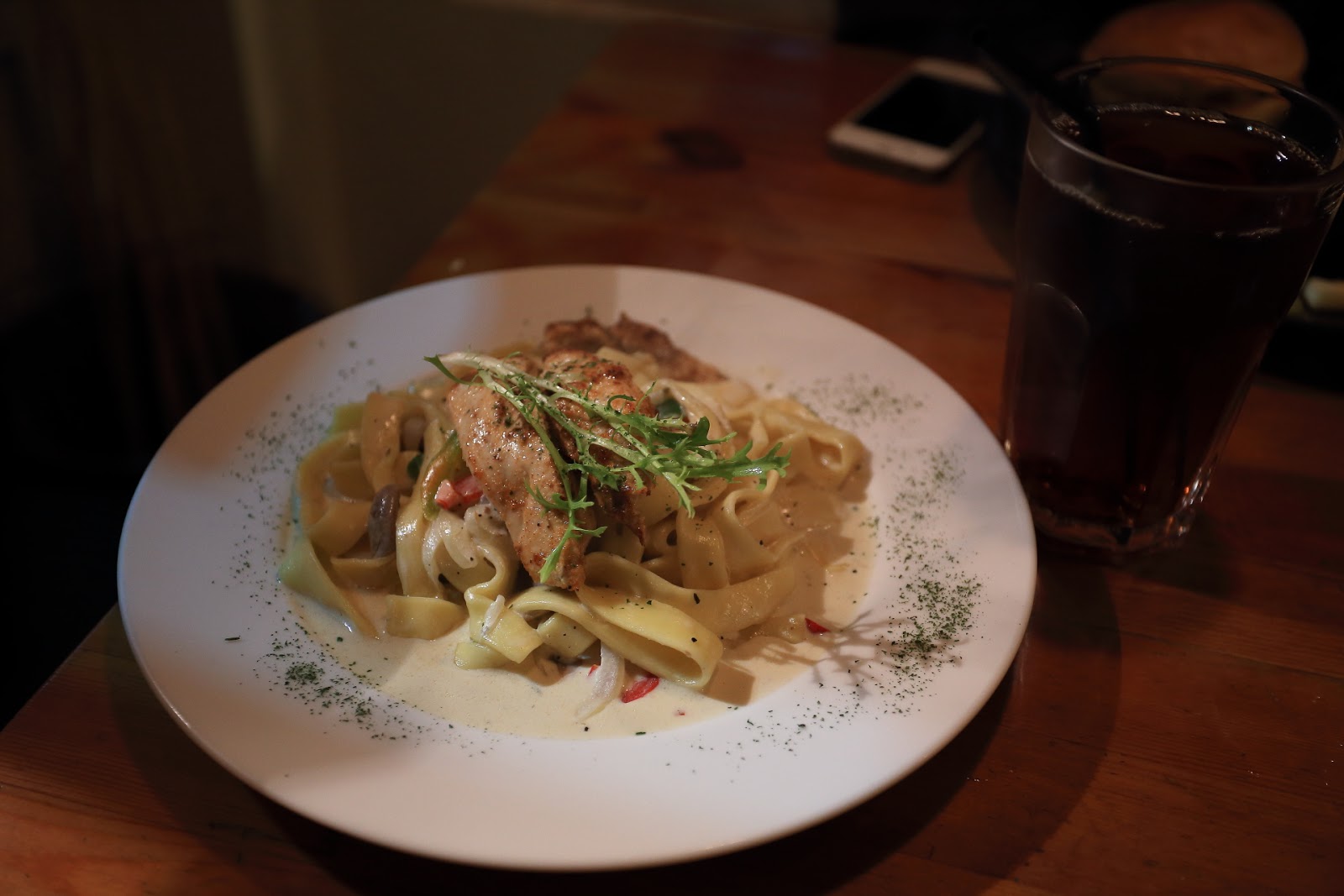 寬蛋麵是籌學費自製的手工義大利麵,我愛它咀嚼時所帶來的那股彈牙感,滑順的奶油醬汁沾附在稍有厚度的麵條上,你很難抗拒第二口的誘惑,上層擺放的香煎雞排,大大地增加了飽足感。