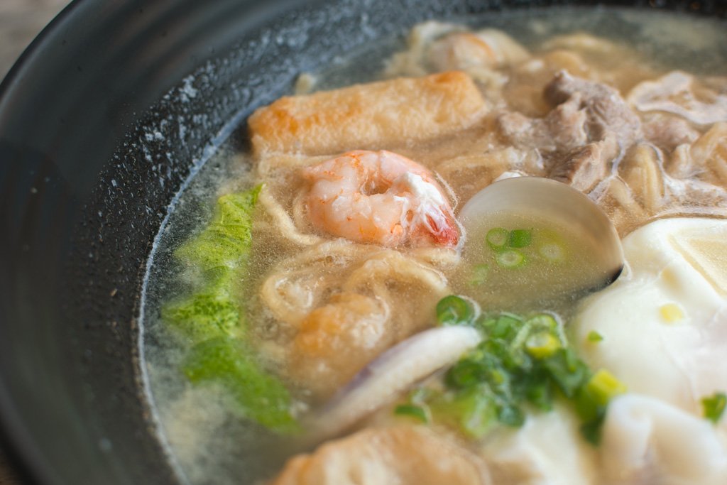 津屋的鍋燒意麵,確實就是再平常不過的柴魚高湯,但該有的配料皆吃得到——小白菜、雞蛋、魚板、鮮蝦、豬肉片、蛤蠣…等,而且蝦子個頭雖小,仍是很有誠意的事先撥好放在裡頭。