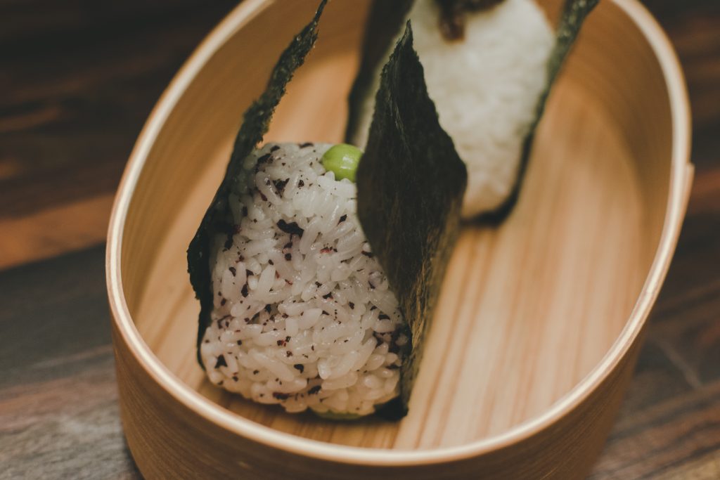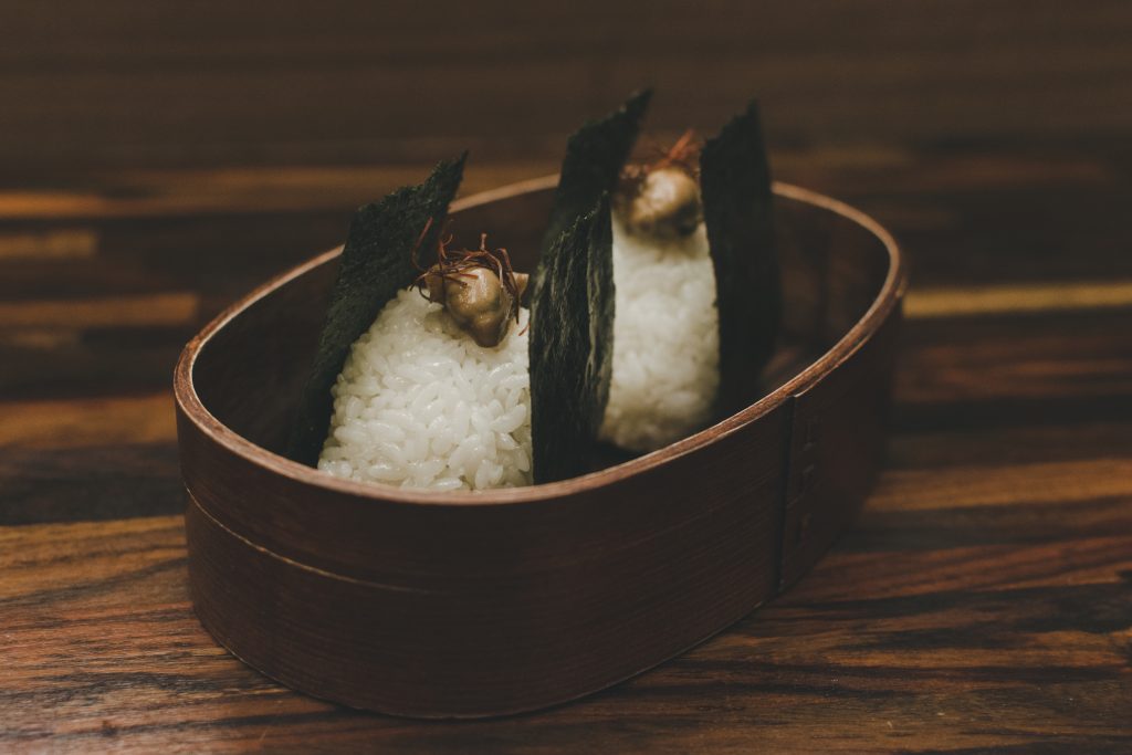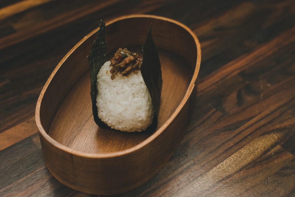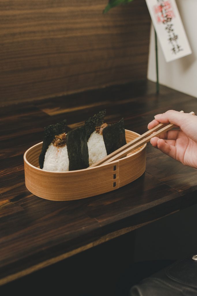 飯糰以木製的便當盒裝盛,附上筷子食用,不過若雙手乾淨,可捧起飯糰來食用,整個吃飯糰的過程會更加舒心。