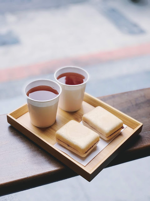 如果有人想吃吃看最中,現在不用一定得買禮盒才能吃到,現場可以點一份現烤最中、一杯茶坐在店門口品嚐。