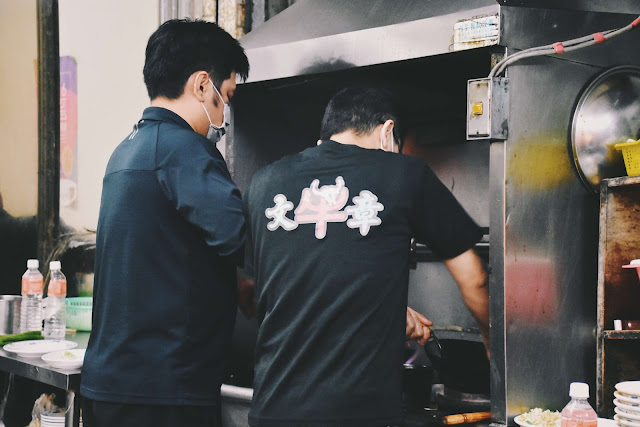 店門口的師傅快手拿起鍋鏟炒得火熱,熱炒出的香氣被火燒得滿天飛,一走進店裡左手邊的料理台上,大塊的鮮紅色牛肉正在被分切、處理,那美麗的顏色、紋理和筋絡足以證明它的新鮮度,店家牛肉是源自善化市場新鮮直送,強調絕對是現宰的溫體牛,看到這番「血腥」的處裡的場景,我是信了!