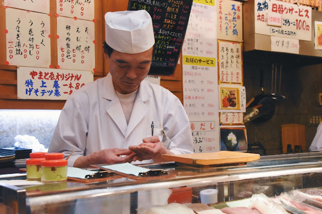 黑門市場是到了大阪觀光客必去參觀的地方,有得吃、有得看、有得買,商家一間間挨著開,在去之前,其實沒有多想過要吃什麼,沒想到一抵達現場,各式乾貨及鮮物讓人逛得飢腸轆轆,突然沒來由的很想吃壽司,從街頭逛到巷尾,最後停在一家外邊看起來不起眼,但瞧到裡頭似乎熱鬧非凡的やまと屋(大和屋壽司)。