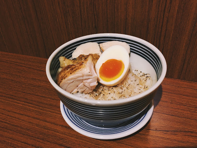 這天晚上再次經過,恰好因為雨天店內無人,趕緊進來點一碗麵,這次很幸運的還撿到最後一碗叉燒丼(後來進來的仁兄抱歉了),叉燒丼除了炙燒雞腿肉、燻製雞胸肉、溏心蛋,最令人驚喜的是,輕輕用火烤過的飯,底下藏著調味過後的奶油,香氣逼人,拌了拌吃下,簡直美味到不行啊!