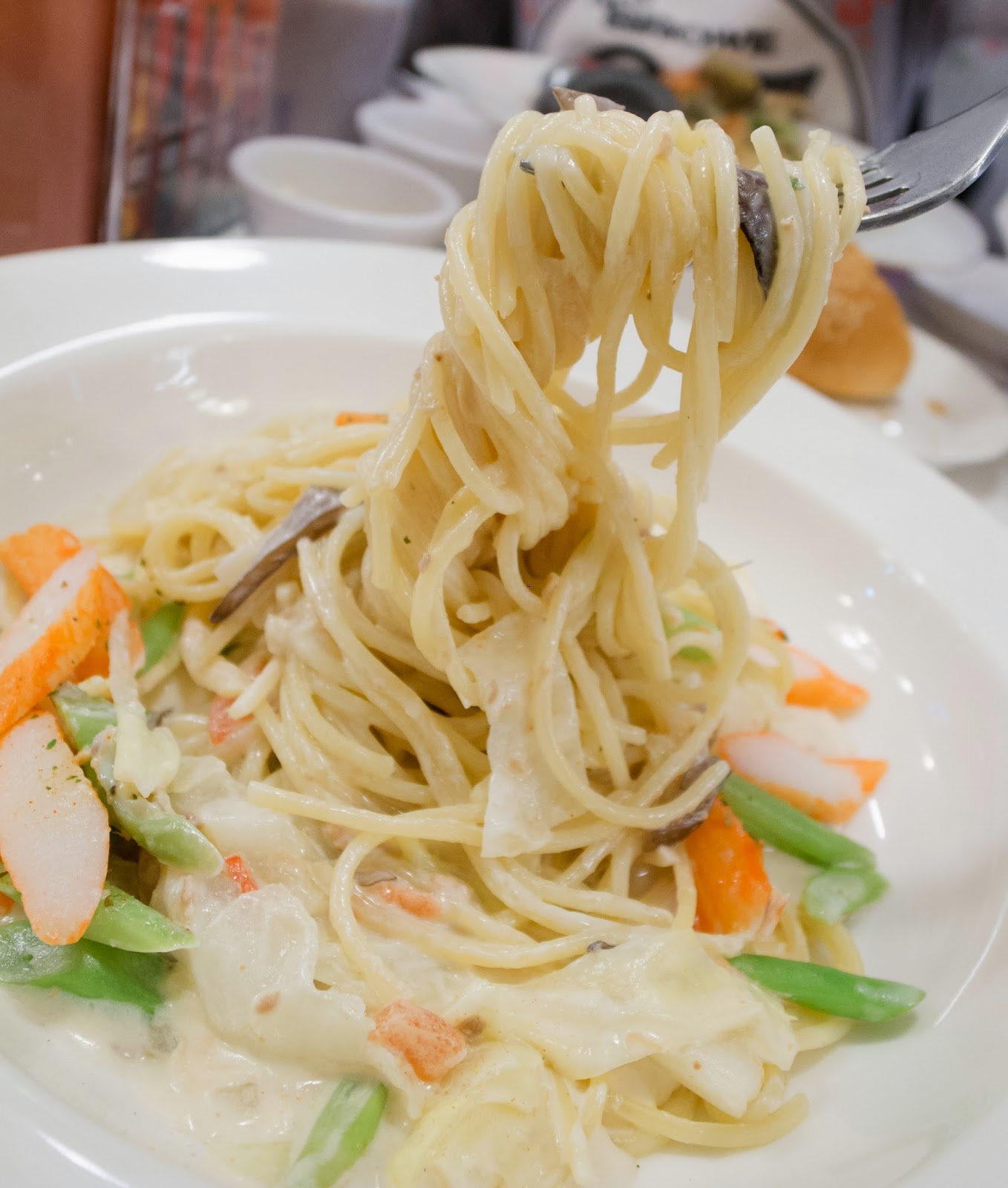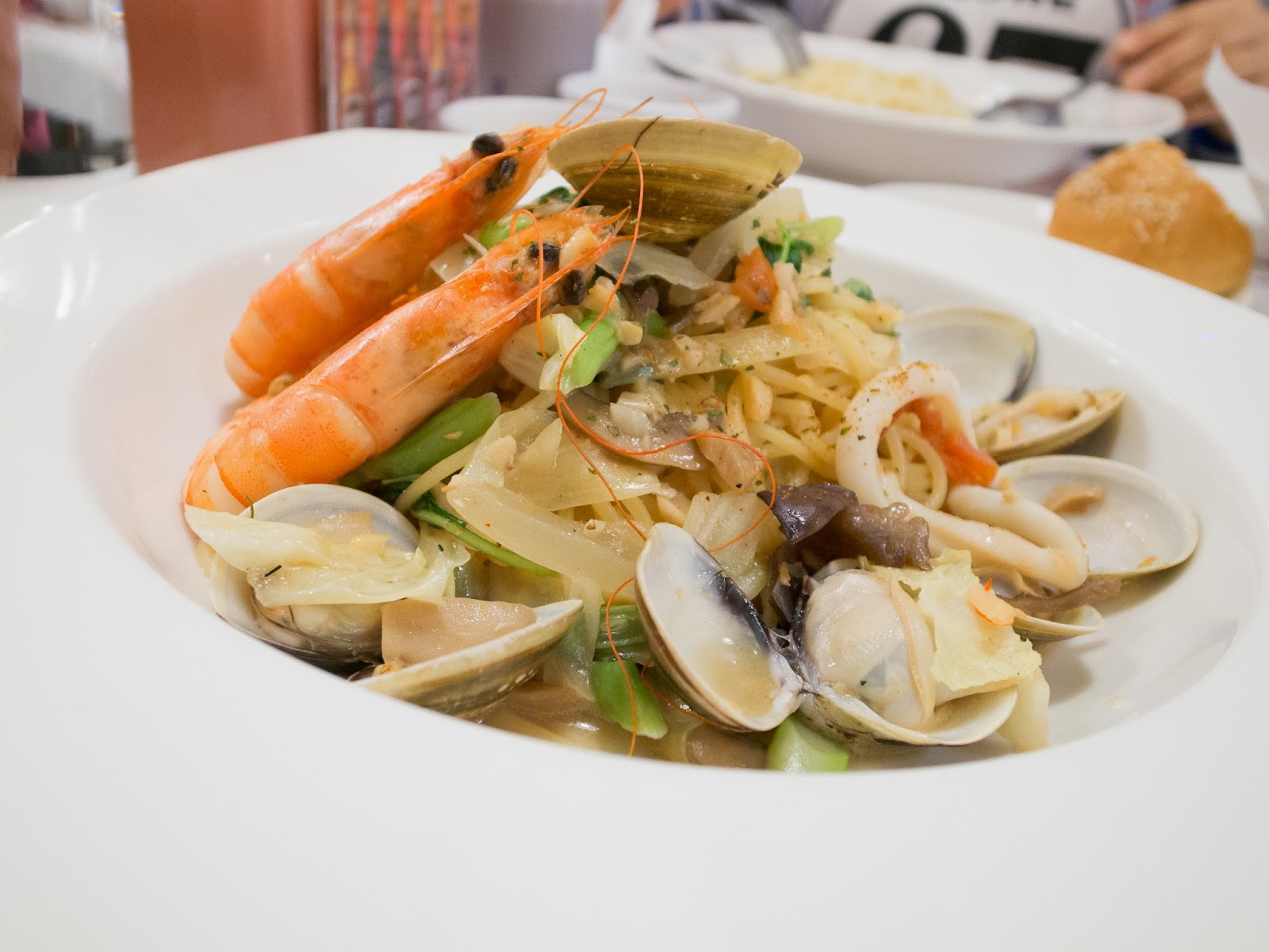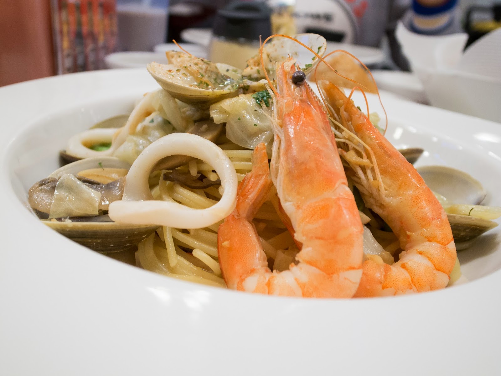 兩隻新鮮的草蝦、花枝以及多到快要滿出來的蛤蜊,完完全全地蓋過義大利麵,前面提到的三種蔬菜也出現在這裡面,這道白酒香蒜澎湃海鮮義大利麵端上桌簡直是實至名歸,無庸置疑。
