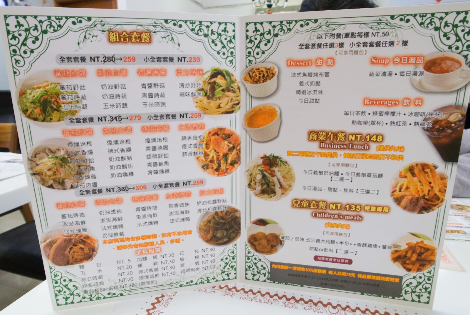 點餐方式有分單點以及套餐兩種,一般的組合套餐又分「全套套餐」以及「小全套套餐」;全套套餐的附餐可以從甜點、湯品和飲料任選三樣,小全套套餐則是選兩樣;另外商業午餐只要$148+10%,除了可享用餐前麵包,附餐跟全套套餐一樣,可三選二,這樣的價錢真的很划算。