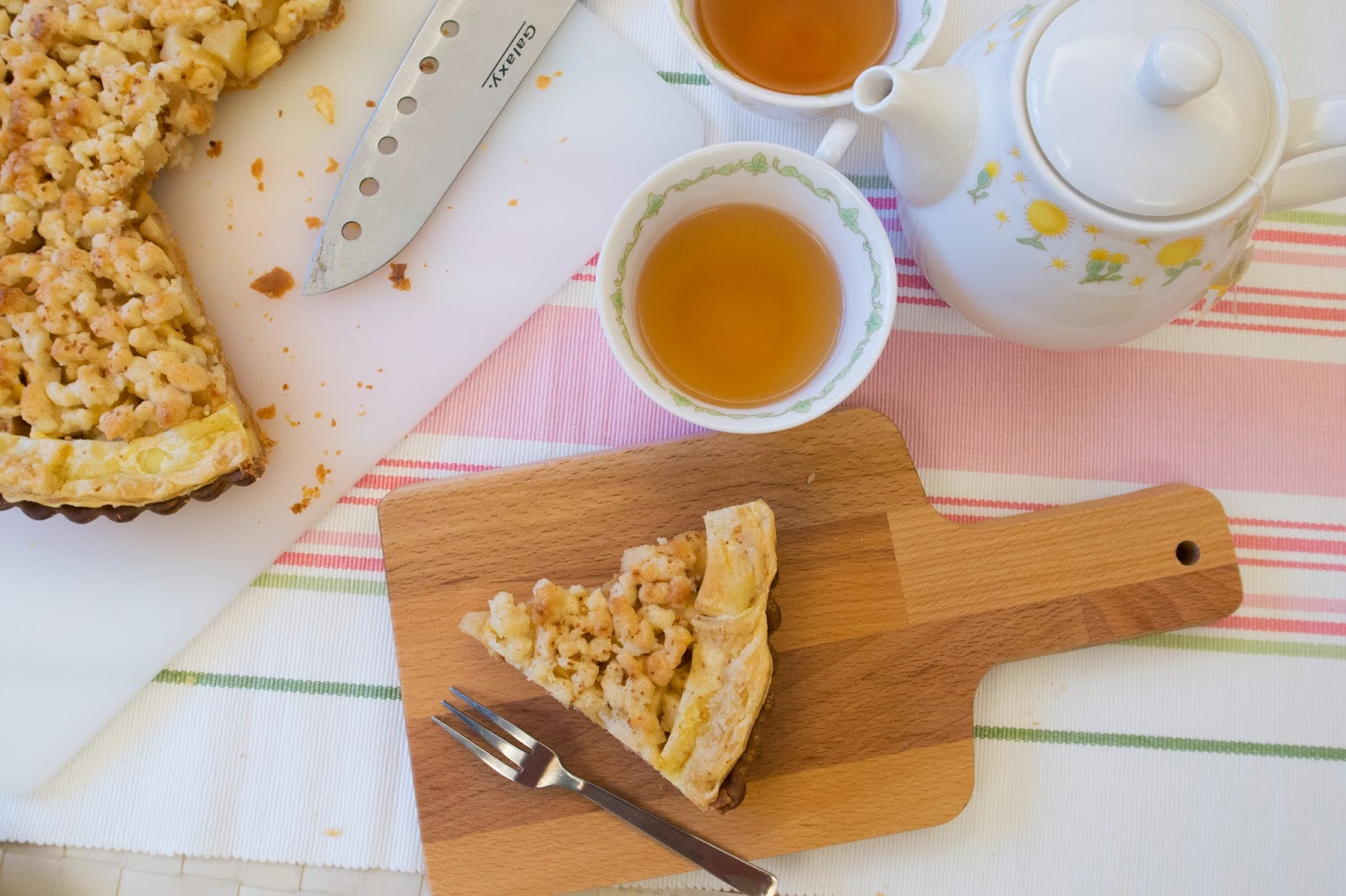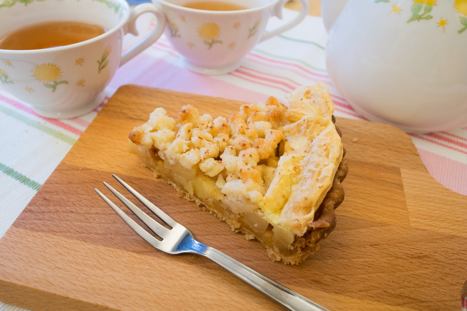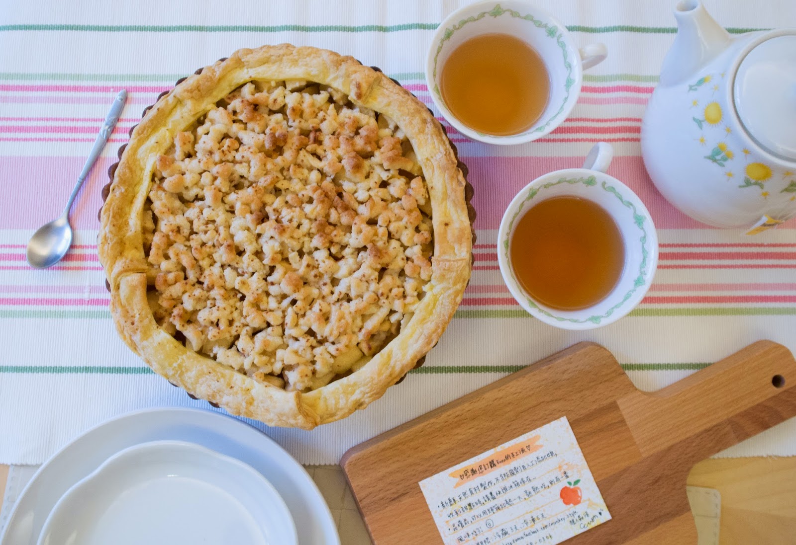 切下幾小口來試試,蘋果丁與奶酥混合在一起咀嚼時充滿顆粒的口感,雖然採用油酥皮讓蘋果派的味道更豐富了些,使品嚐時除了一股淡淡的果香及肉桂味,還會散發出濃烈的奶油香氣,但相對來說,也因為使用油酥皮,會產生較為強烈的油脂感,不過一邊搭配我很愛的TWININGS英式伯爵茶,卻很契合,伯爵茶帶來的柑橘味大大的沖淡了甜膩感,這組合算是相當討喜。