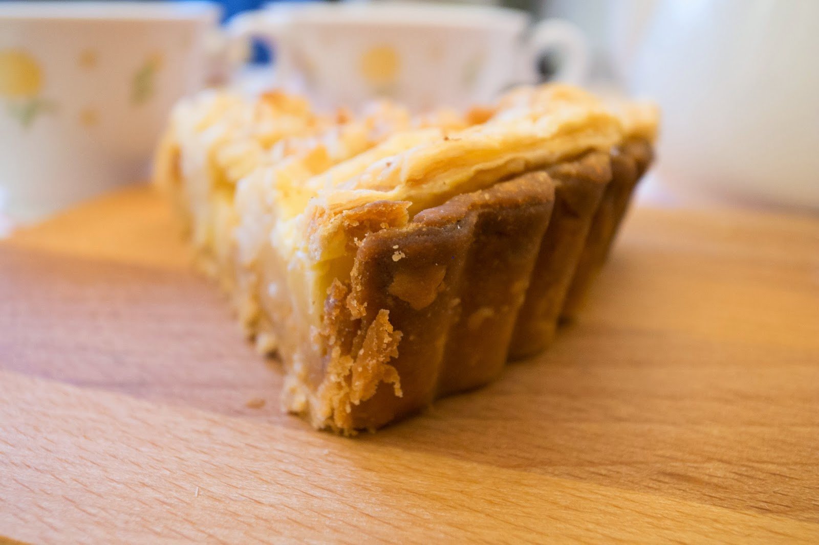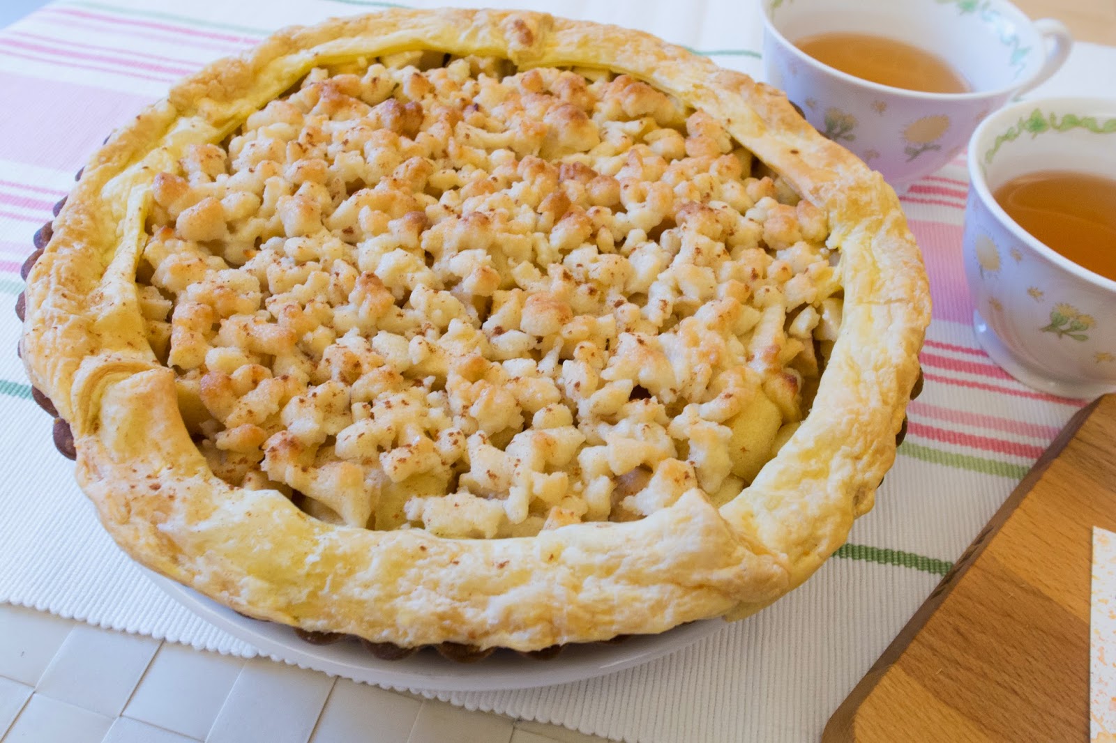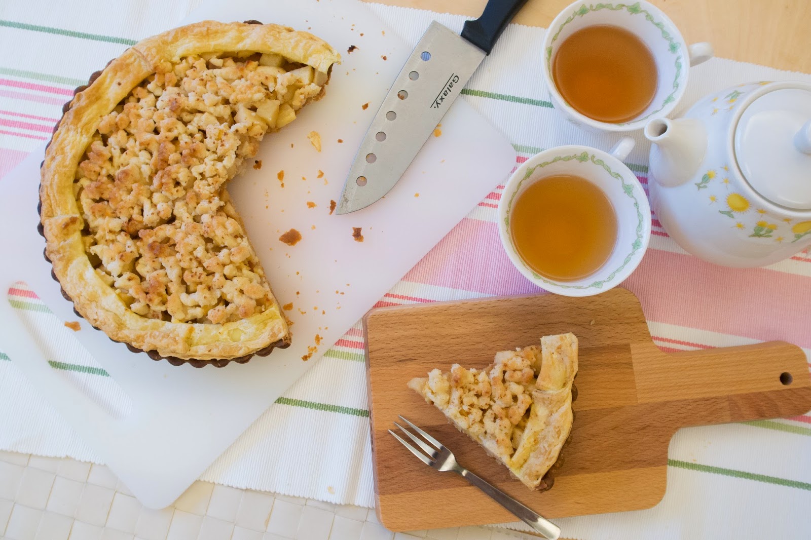切下幾小口來試試,蘋果丁與奶酥混合在一起咀嚼時充滿顆粒的口感,雖然採用油酥皮讓蘋果派的味道更豐富了些,使品嚐時除了一股淡淡的果香及肉桂味,還會散發出濃烈的奶油香氣,但相對來說,也因為使用油酥皮,會產生較為強烈的油脂感,不過一邊搭配我很愛的TWININGS英式伯爵茶,卻很契合,伯爵茶帶來的柑橘味大大的沖淡了甜膩感,這組合算是相當討喜。