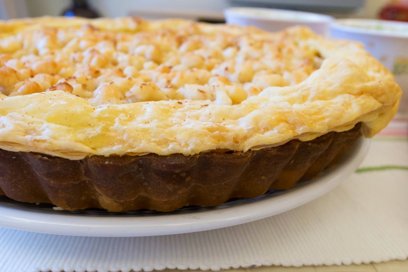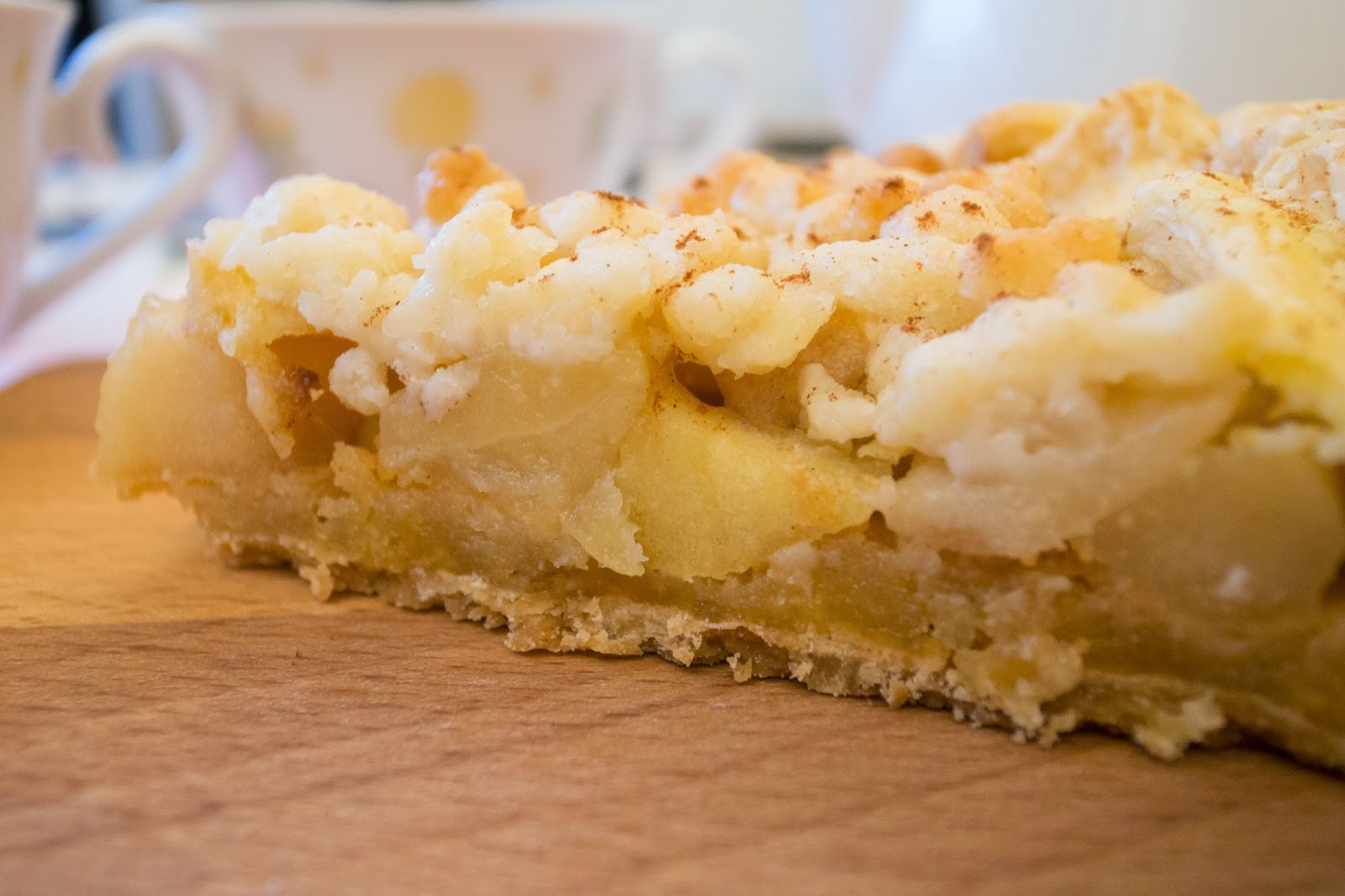 派的外圈也用了派皮扎實的圍繞,側面看整體厚度十足,而鋪在最上層,看起來一粒一粒是那油滋滋的奶酥,隱約還可以看見藏在底下的蘋果丁。