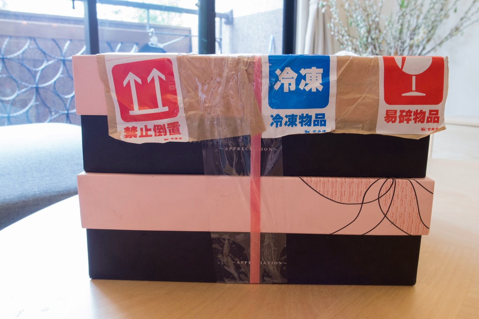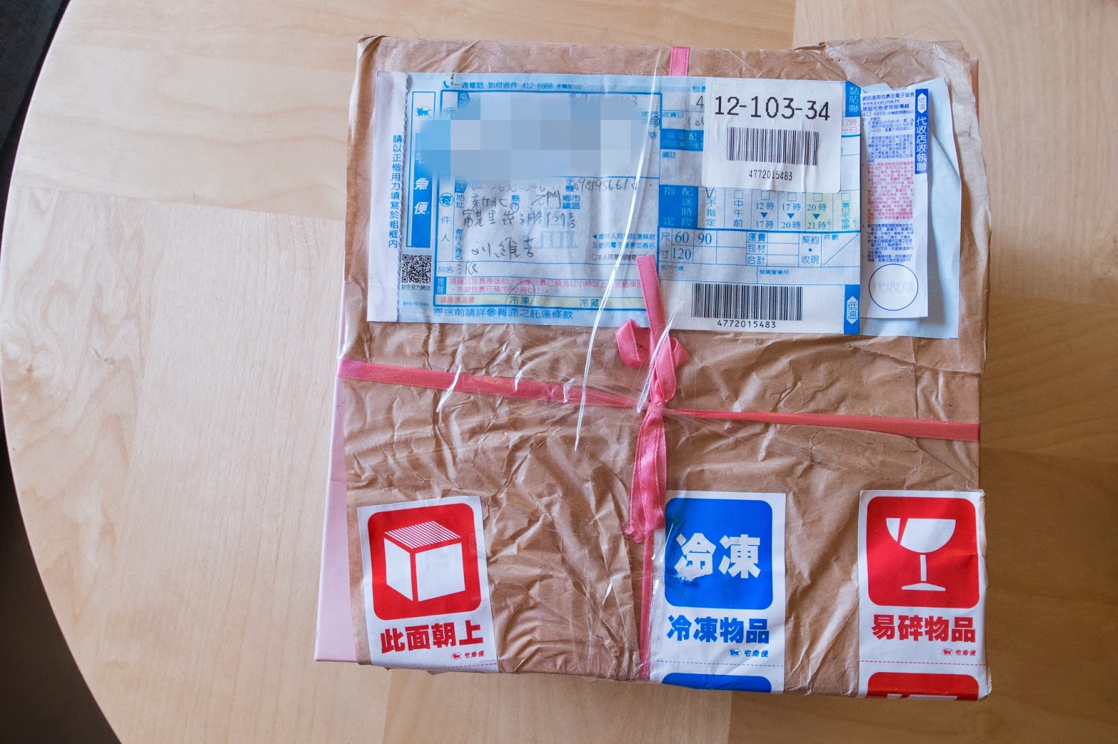 送來的兩個派分別用紙盒裝載,並用繩索綑綁在一起,包裝外也特別說明內容物是易碎的冷凍物品。