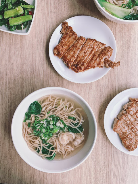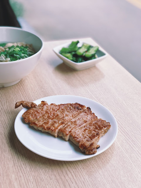 享受著下午和煦的陽光,在安靜的住宅區裡,攤子前只有一群貪吃之徒,一起窸窣吃著令人口齒留香的湯麵,以及讓人意猶未盡的現煎豬排。