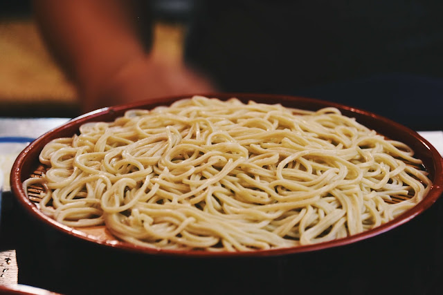店內大片的玻璃櫥窗裡,師傅正現做蕎麥麵,粉末隨著師父的手勢揚起,我看得目不轉睛,很想拿起相機拍下, 但怕會打擾到店家,所以最後只用眼睛記住這樣的畫面。