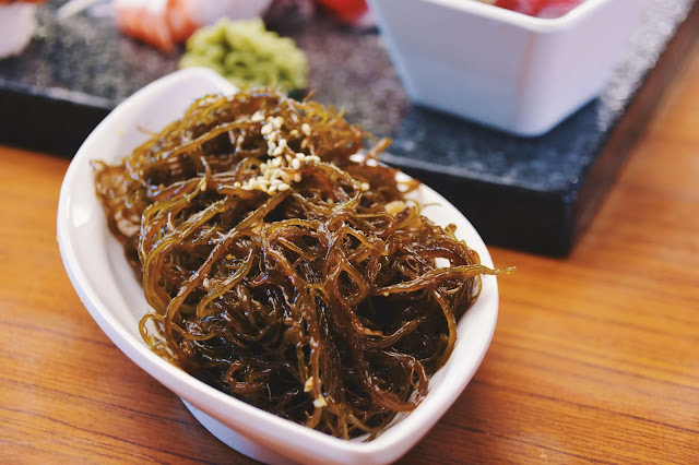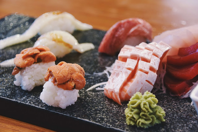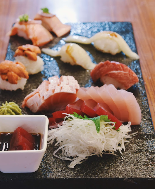 點了綜合生魚片、炙燒鮭魚肚握壽司、炙比目魚鰭邊肉握壽司、北海道海膽握壽司及涼拌海菜,當時恰逢黑鮪魚季期間,所以還順帶點了一個黑鮪魚上腹握壽司試試。