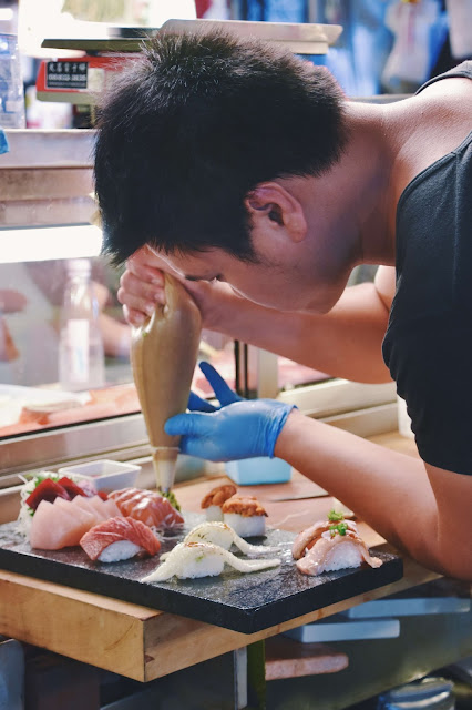 老闆十分講究環境衛生,戴上了手套製作壽司,畢竟魚市場裡的用餐環境比不上餐廳,身為小攤,這點細節能讓客人吃得安心。