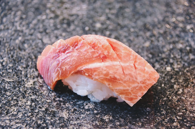 他的手法自有特色,雖並非傳統日式料理的師傅手法,倒也不像一般台式日本料理店那樣胡亂的捏,可說獨樹一格,且握壽司捏的很飽滿,甚至還仔細的擺盤才上桌呢!