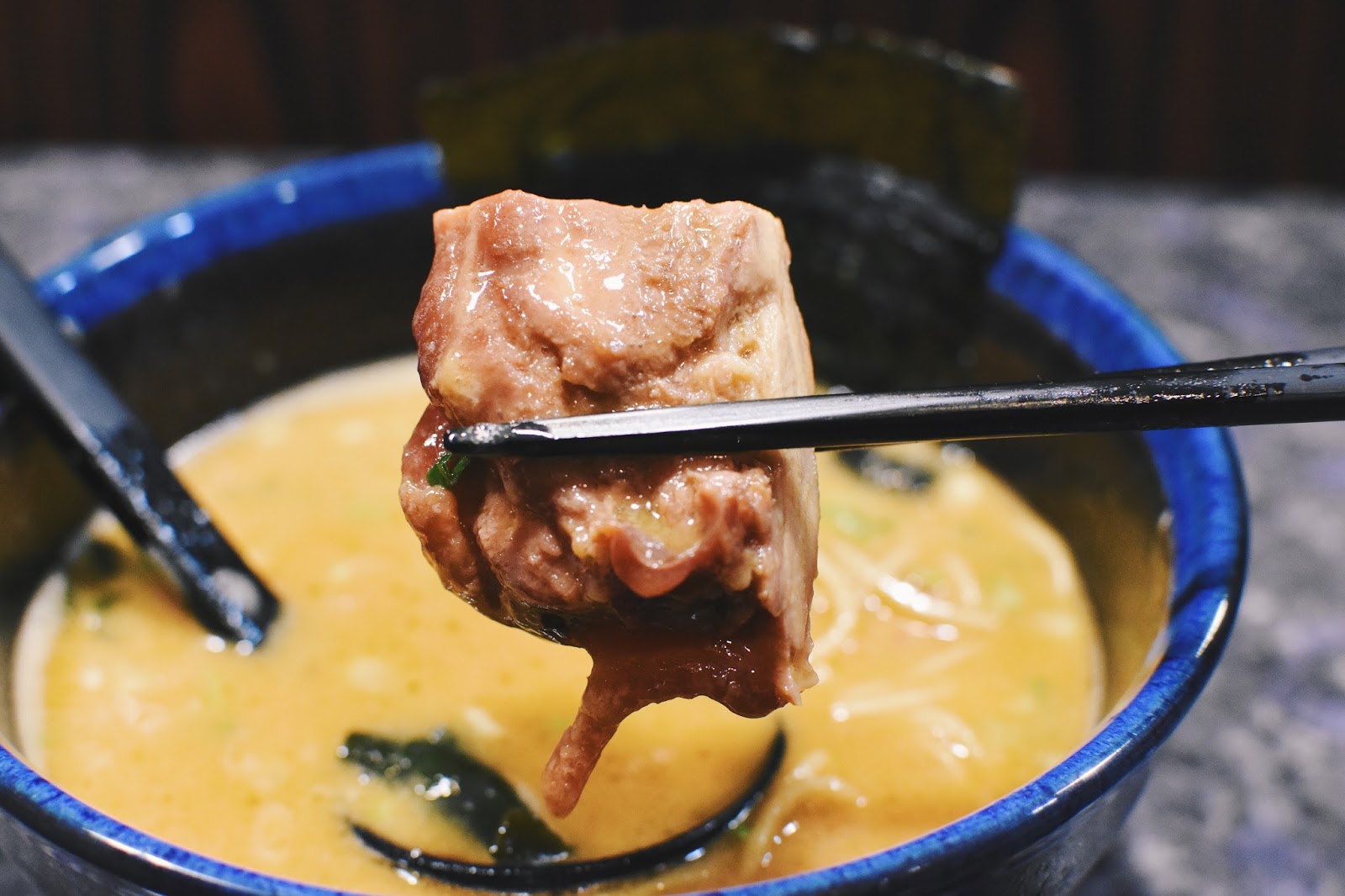 黃橙色的湯頭,濃度適中,上面鋪上一片海苔,撈了撈裡頭竟然有雞丸子,比雞叉燒還要驚喜。