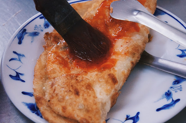 餅皮厚實,口感微酥,瞧見旁邊有甜辣醬,便在上面來回刷了一些。