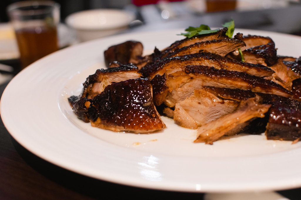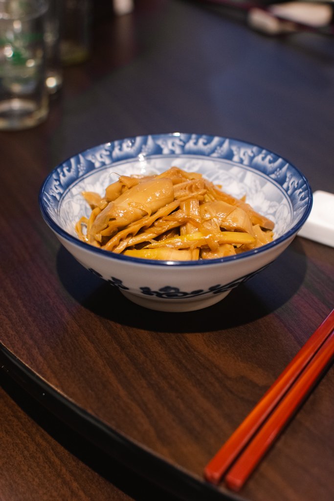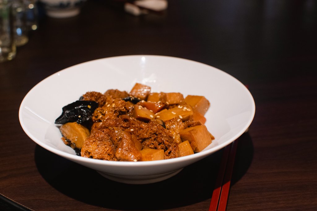 其味拿捏在鹹甜之間的冰糖醬鴨。醬色深邃而美麗,在廚燈下絢爛閃爍。我一吃立馬聯想到東山鴨頭,但這不像東山鴨頭有著炸過後的油膩感。最美味是濃縮集大成那口感堅韌的鴨皮,令人吮指回味。