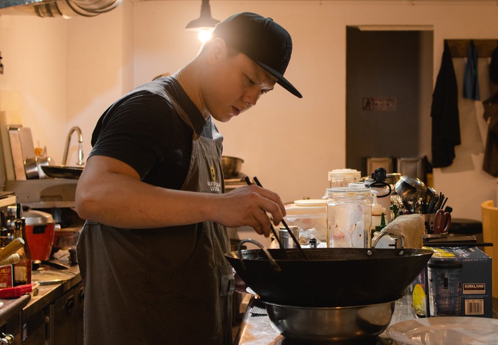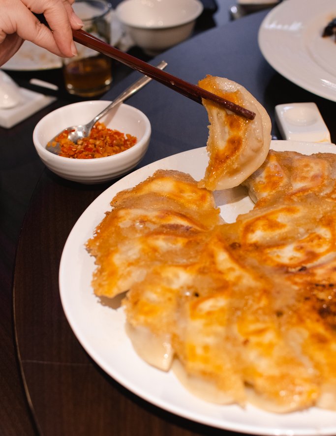 主廚瞧我們各個相機拍不停,忽然從廚房走出,平底鍋是即將翻面的煎餃。