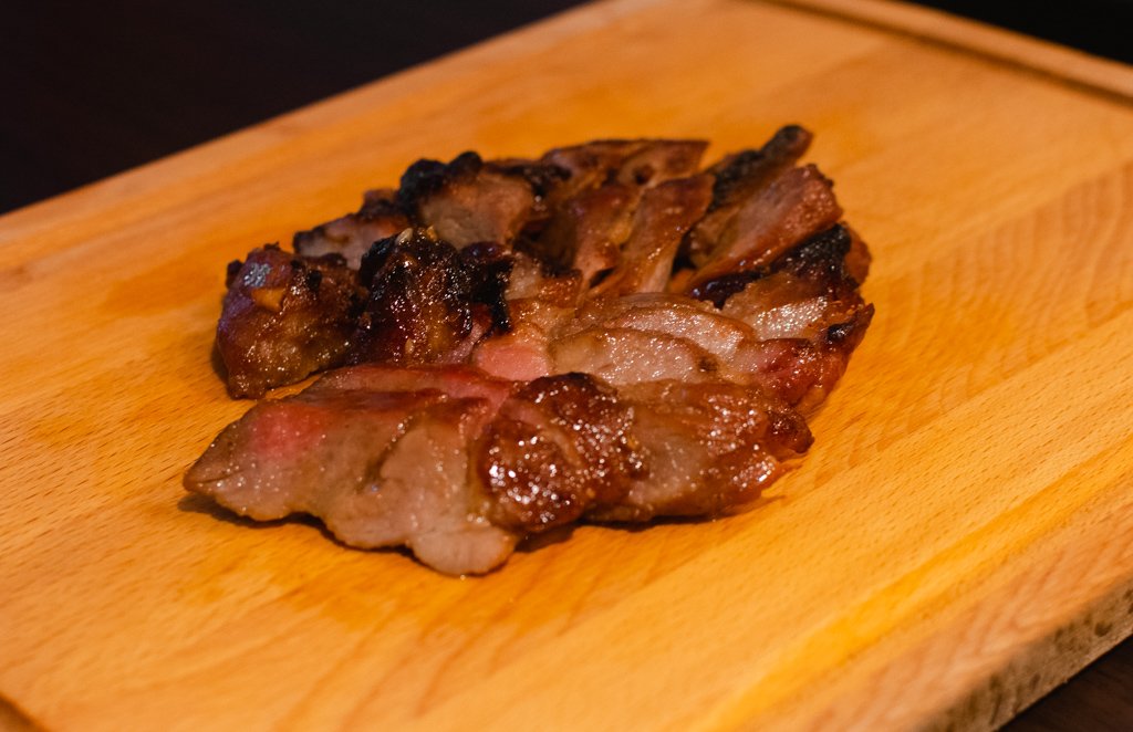 切成片擺在木盤上的杭式蜜汁燒肉,與前幾道如出一徹的概念,同樣都是走鹹甜的路數。沾染著炭烤後的香氣,鹹甜之外還帶有焦香。