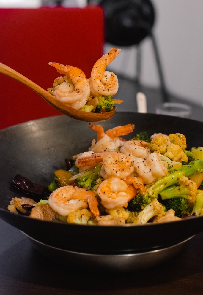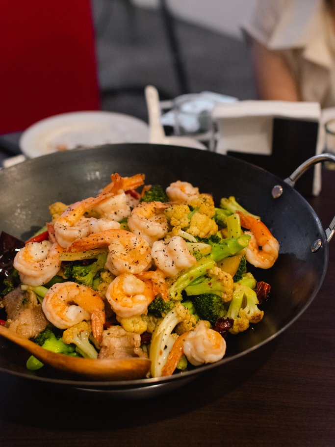 緊接在香酥鴨後面是乾鍋蝦仁花椰菜,連鐵鍋一起豪邁上桌。花椰菜有大火過後的微微鍋氣,乾辣椒及其他辛香料,讓花椰菜沾染香辣口感,喜歡!