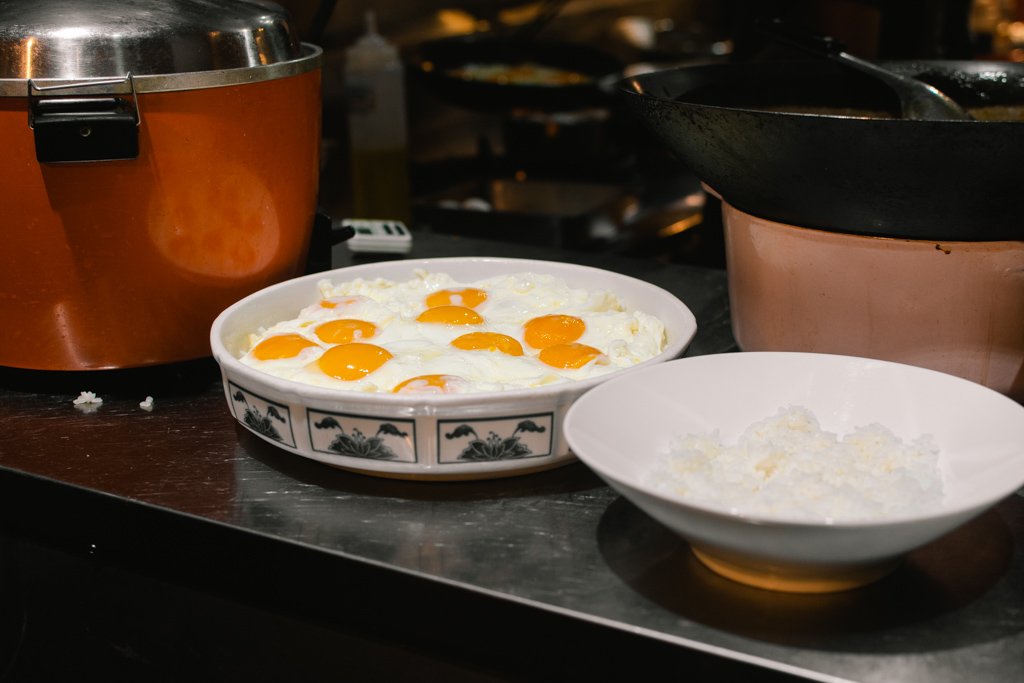 主廚在備這道料時,我們都忍不住跑去料理台前,看他們如何煎出滾圓的太陽蛋,煎好後一股作氣「滑」進盤中,鋪在白飯上的動作好療癒。