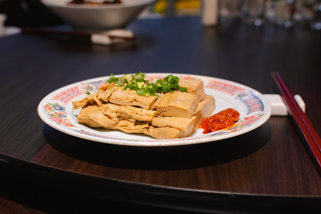 豆皮沾自製的辣椒醬挺對味;黃金泡菜也醃漬得酸爽開胃,而烤麩要是再鬆軟些會更好吃。