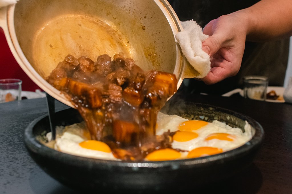 滾燙的東坡肉被帶到桌邊,華麗登場。以花雕酒嗆鍋——滋的過癮聲響,聽得飢餓,看得也飢餓。待酒香揮發,一口氣倒入鋪好煎蛋們的大盤中。
