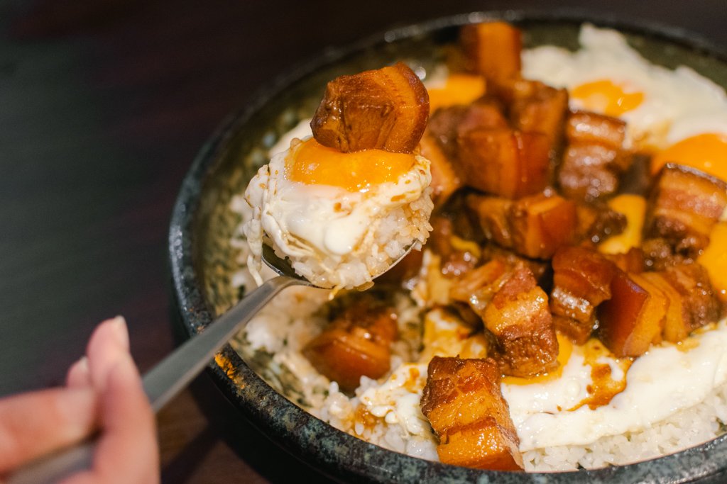 大夥兒紛紛迫不及待舀起裝盛到自己碗中,滷肉帶皮的部分膠質黏牙,醬汁和蛋液攪和成一氣,非常下飯。