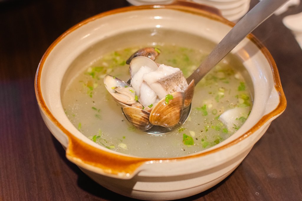 最後的蛤蠣鱸魚湯,也是我今晚喜愛的一道。做為結尾,它恬淡卻又不平淡。以雞骨、豬骨、魚骨熬煮四小時,成就這鍋樸實卻實實在在的魚湯。