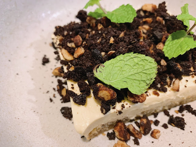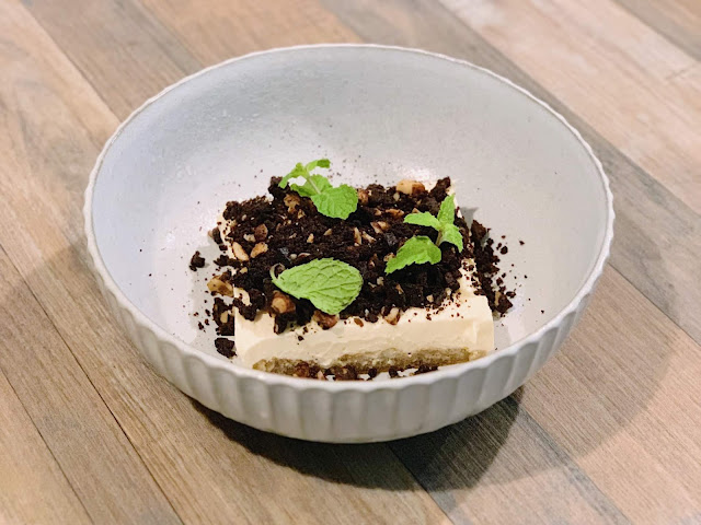 而提拉米蘇以碎屑的巧克力餅乾,來代替一般常見的可可粉,並撒上些許堅果碎片,來增加口感。