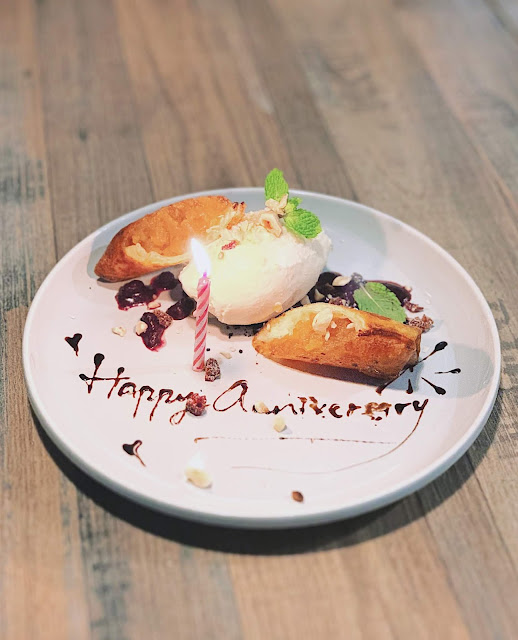 在用網路訂位時,勾選了用餐目的是為了慶祝紀念日,所以店家很貼心的在甜點盤寫了祝福語,並點了個小蠟燭,頓時還真有一點浪漫。