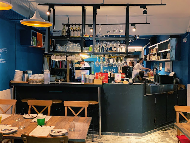 頁小館裝潢簡約,以藍白色調來勾勒餐廳氛圍,彷彿走進了法國山城裡的小餐館,開放式廚房,能看見廚師們仔細妝點料理的神情,而且排油煙系統作得很好,完全聞不到油煙味。