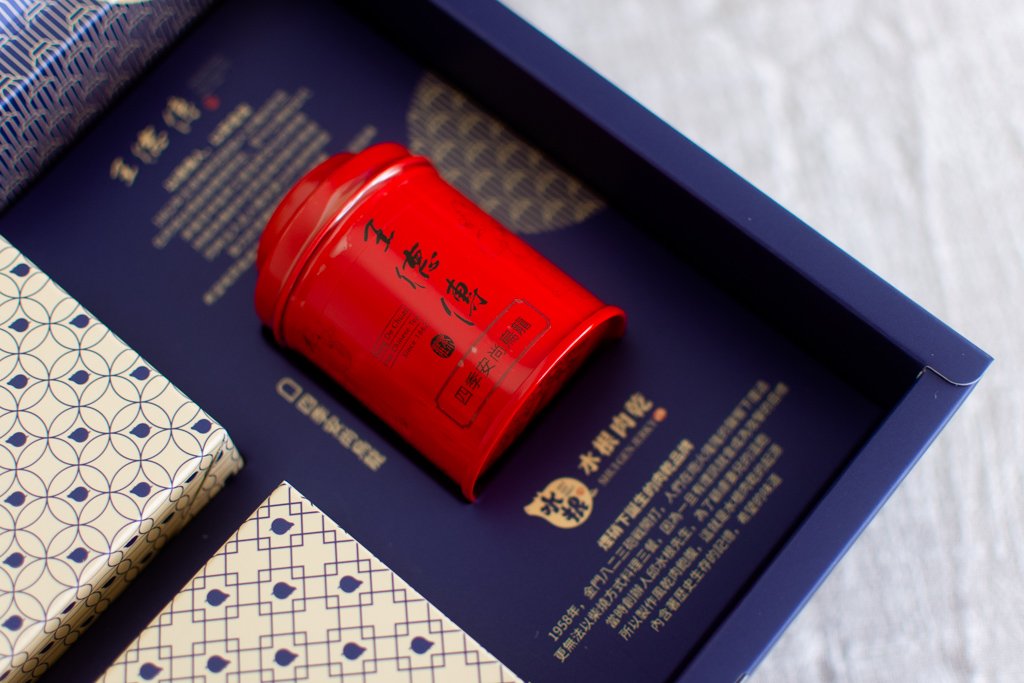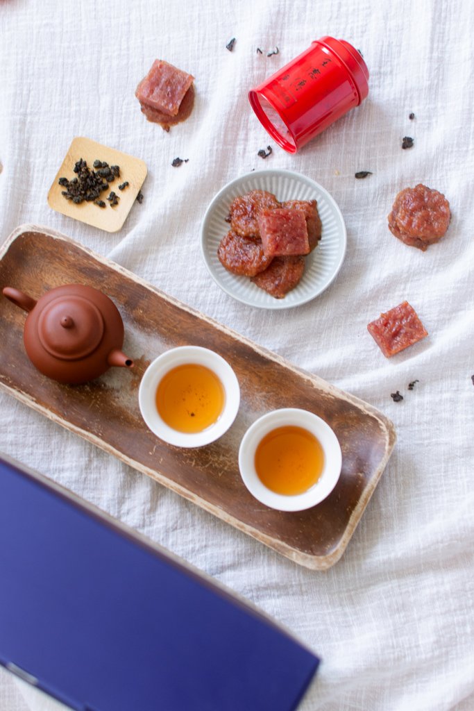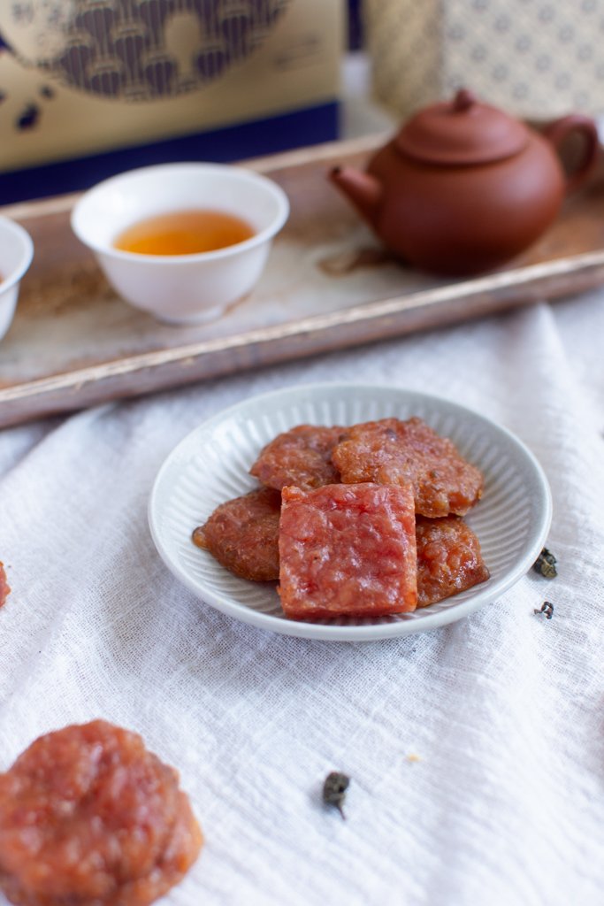 打開禮盒,盒子上方寫著:「西窗盈滿月,思鄉情意深。以方圓紅肉,佐浮金茶湯。」兩句話透出禮盒的內容,肉乾與茶,皆為經歷一甲子與百年時間砌成的品牌。