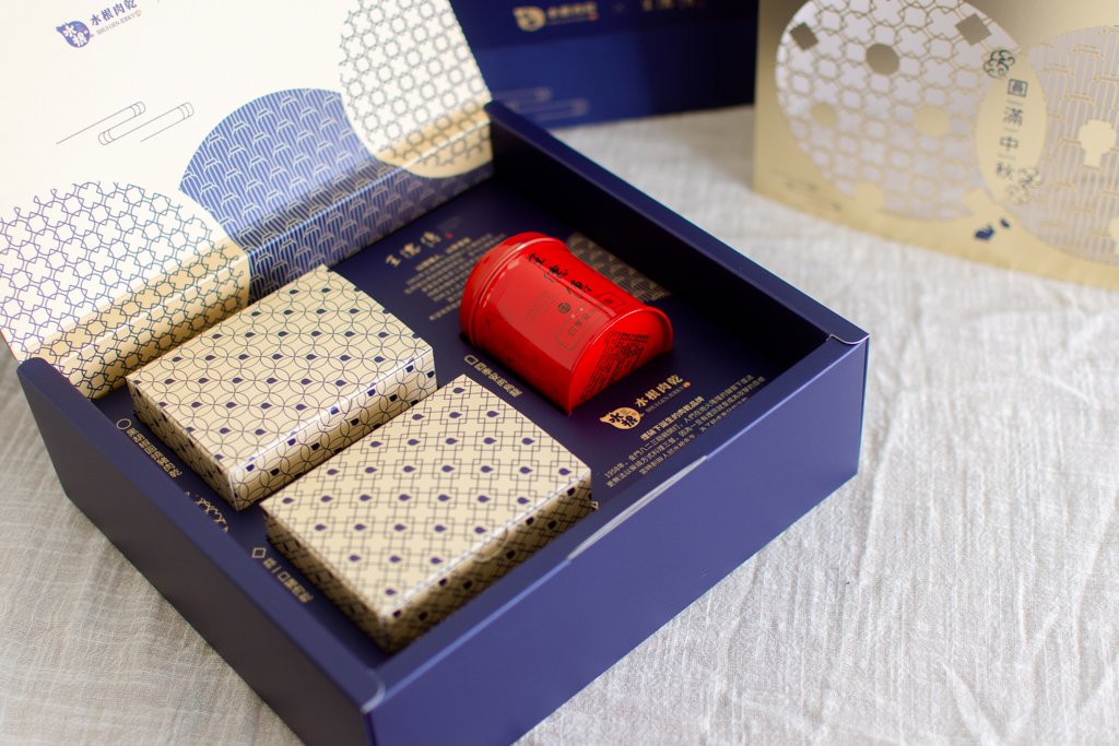 這款頂級肉乾茶禮以沈穩深藍色和典雅的金色相互輝映,盒衣為十分雅緻的紙雕設計,圓形象徵是月圓,紙雕寫著「圓滿中秋」,象徵整份禮盒主軸的概念。