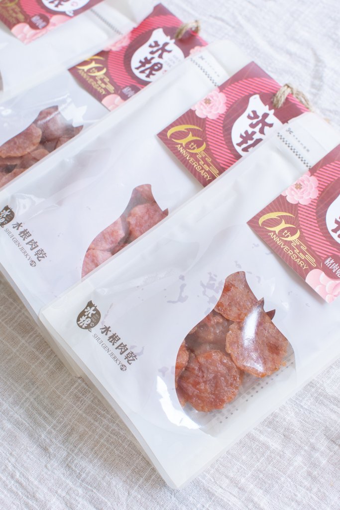 其中為了讓肉乾降低油膩感,水根肉乾使用竹笞製作,經過烘烤預熱,竹笞會吸附肉上的油脂,使得肉乾吃來不會油膩,並用兩段式烘烤,讓肉乾保有彈牙的口感。