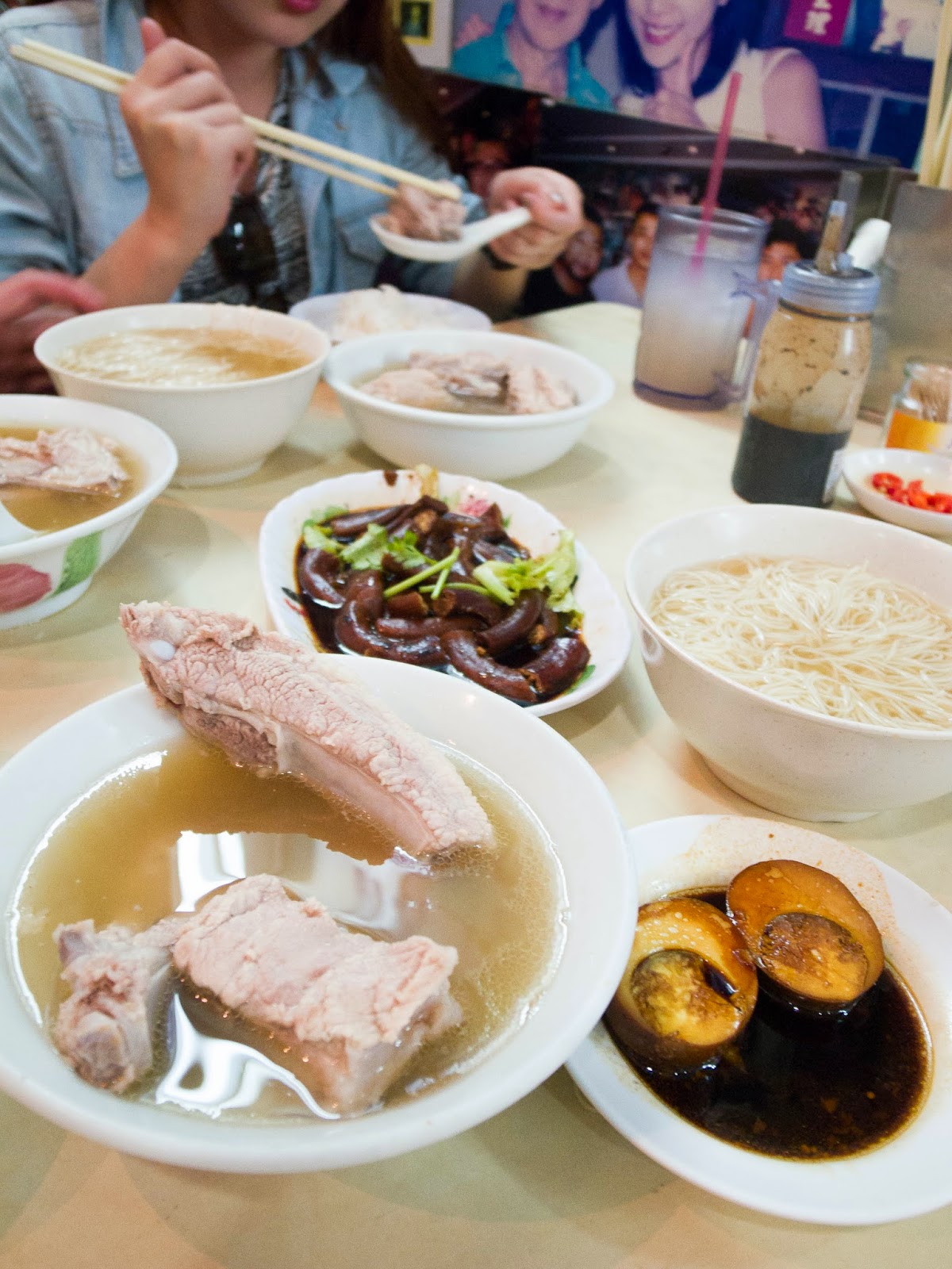 內外場的人都在互相大聲吆喝著,大嬸們熟練的端著熱騰騰的肉骨茶在店裡穿梭,我猜想松發肉骨茶多半也是個家族事業吧!