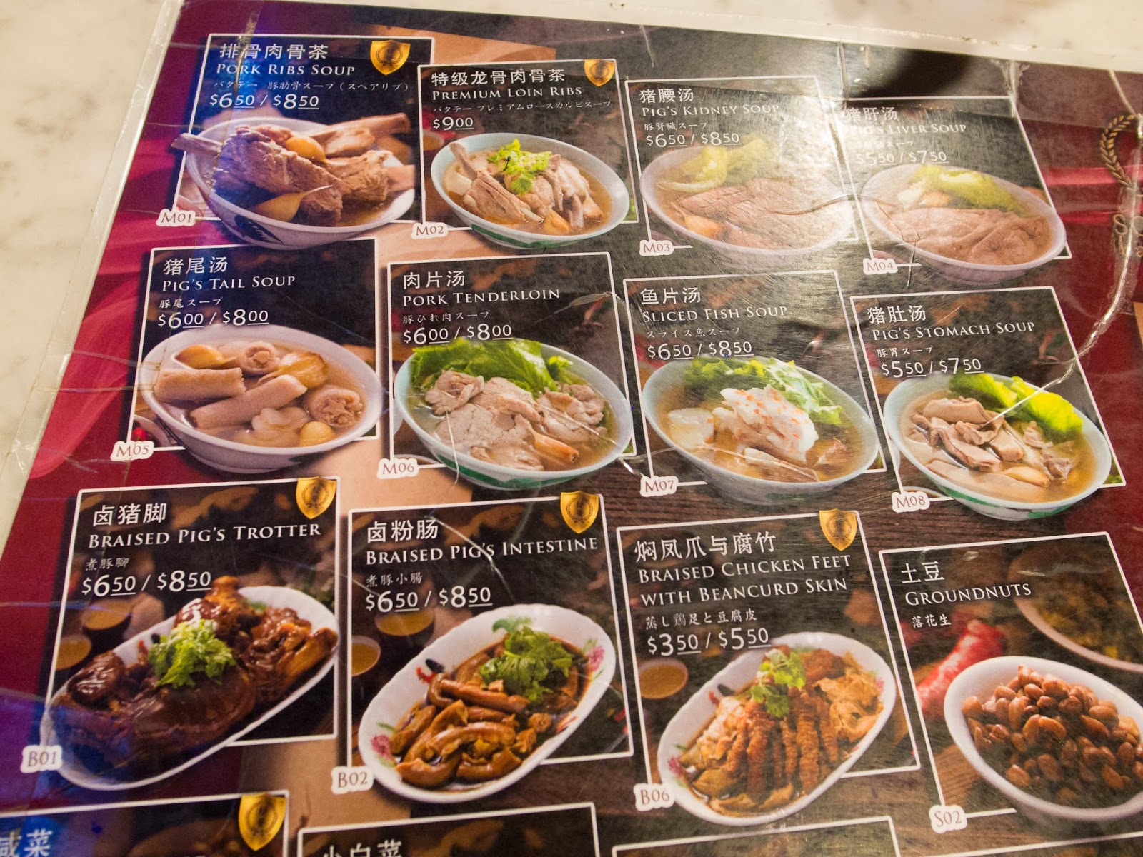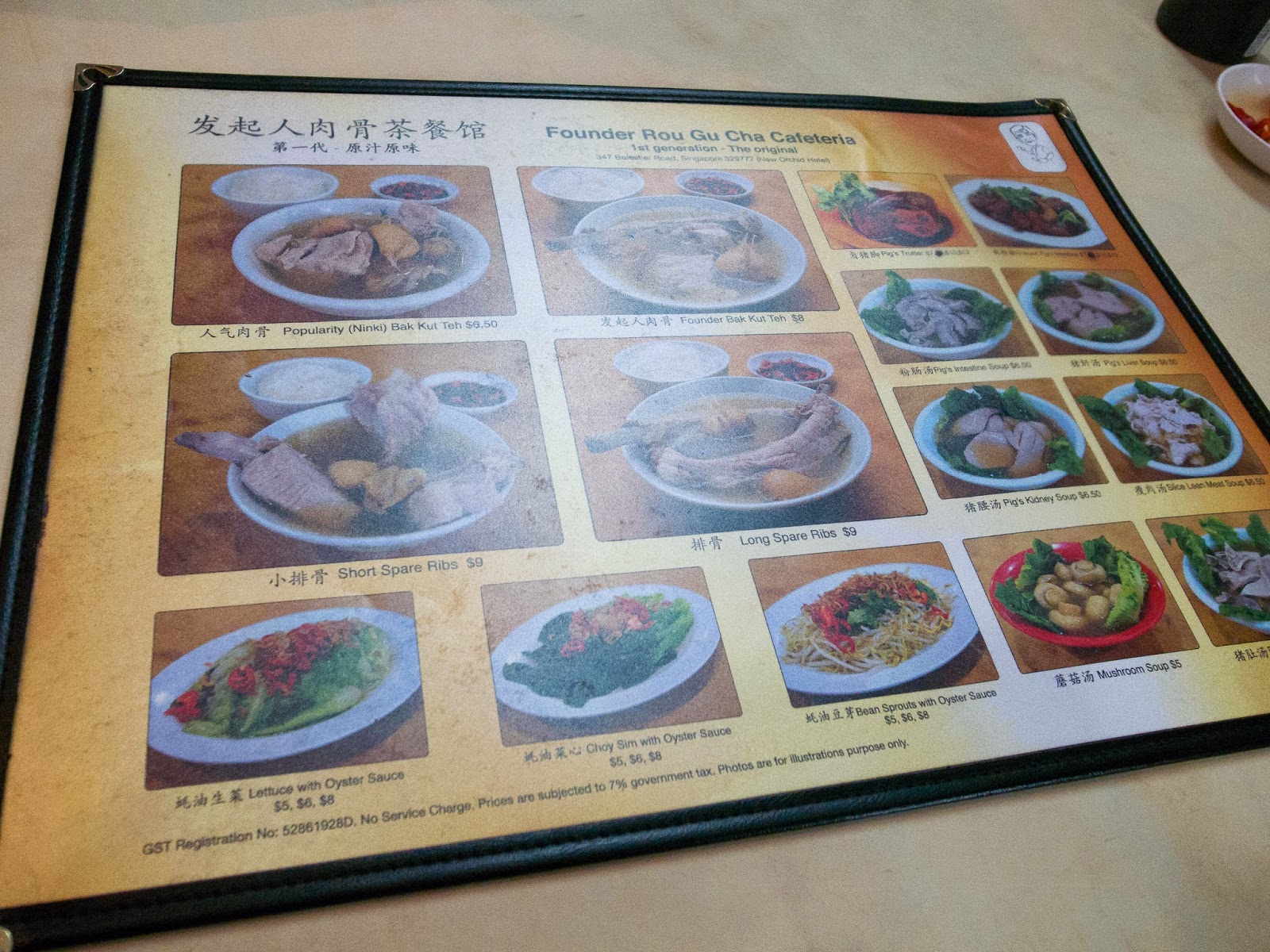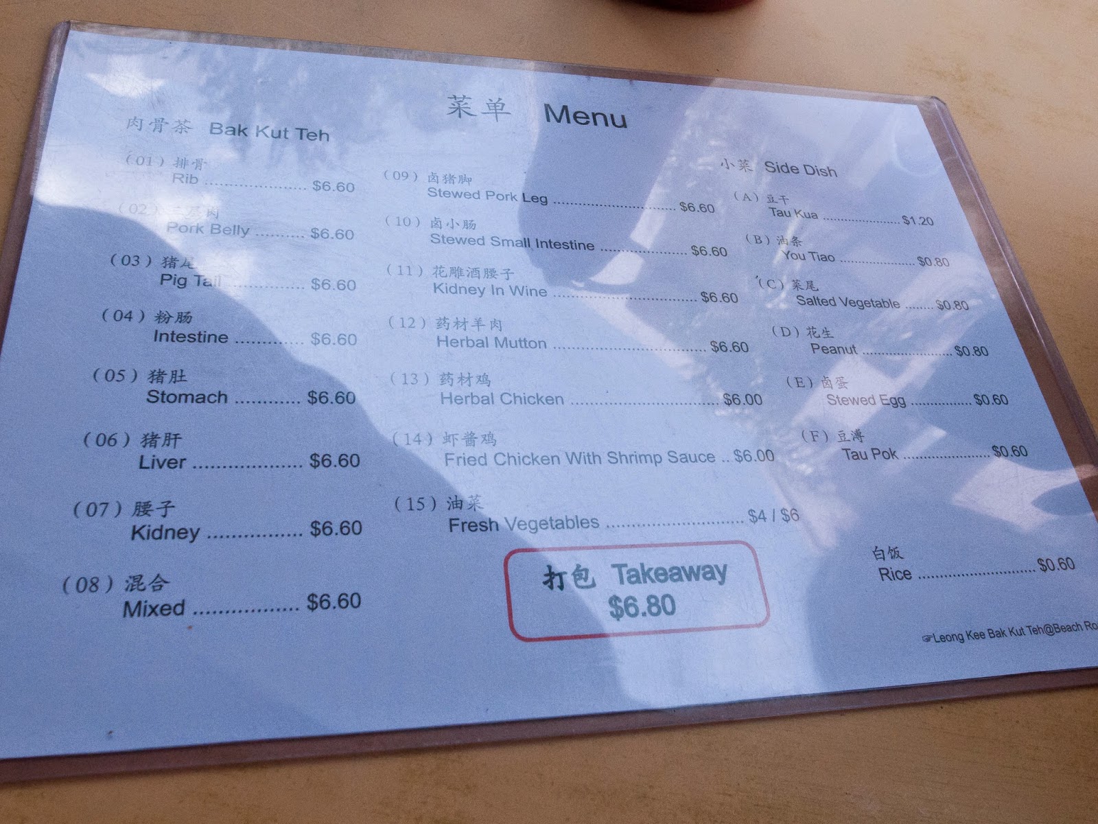 隨意找了個位置坐在店面前的騎樓下,菜單拿到看了一下,除了排骨、粉腸、豬肝等單一口味,也有綜合的選項可以選,價錢一樣,都是新幣$6.6,跟松發的價錢差不多,小菜的項目也不少,點了排骨肉骨茶,店家附上一份油條跟白飯,算是個套餐的形式。
