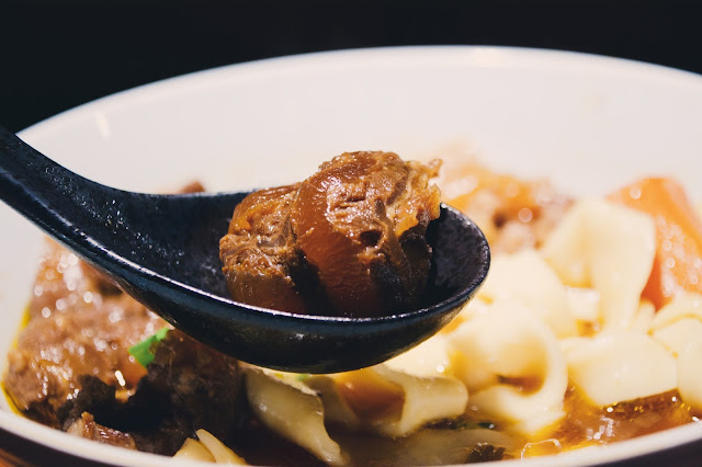 牛肉應是採牛肋條的部位,筋肉之間口感彈牙,咬時須帶點勁,肉香味濃,無乾柴嚼感,藏有肉汁;白蘿蔔顏色之深,證明滷得入味,紅蘿蔔則是輕輕、慢慢地軟爛崩解在嘴裡,有著深沉的大地之味舒展開來。
